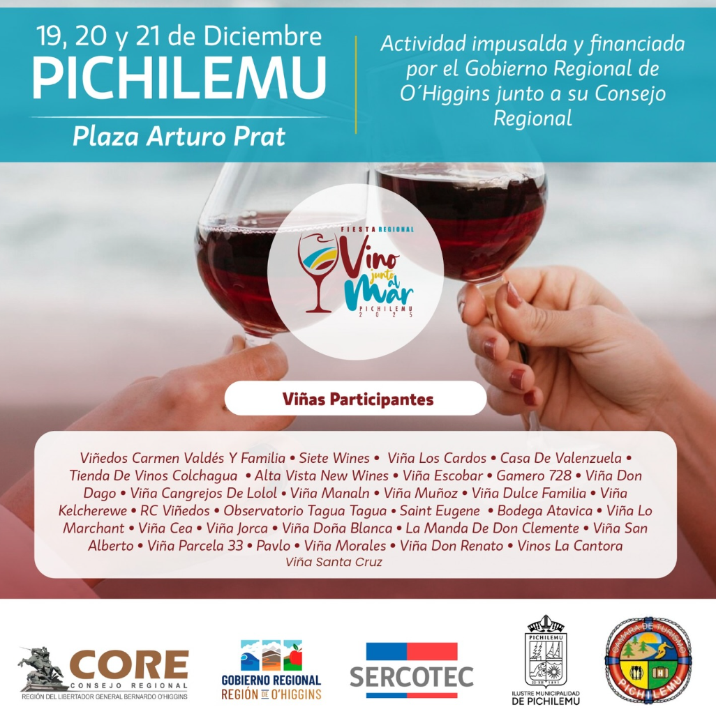 La fiesta del vino “Junto al Mar” -como se ha venido difundiendo- tiene hoy su apertura, a partir de las 20 horas en la Plaza “Arturo Prat” con la participación de importantes Viñas y Productores de vinos de la Región de O’Higgins, aparte de numerosos stands de emprendedores en diversos rubros, como también, de artesanos y una serie de novedades. Fiesta que -con recursos gubernamentales- considera también la presentación de varios artistas, entre los cuales está María José Quintanilla,